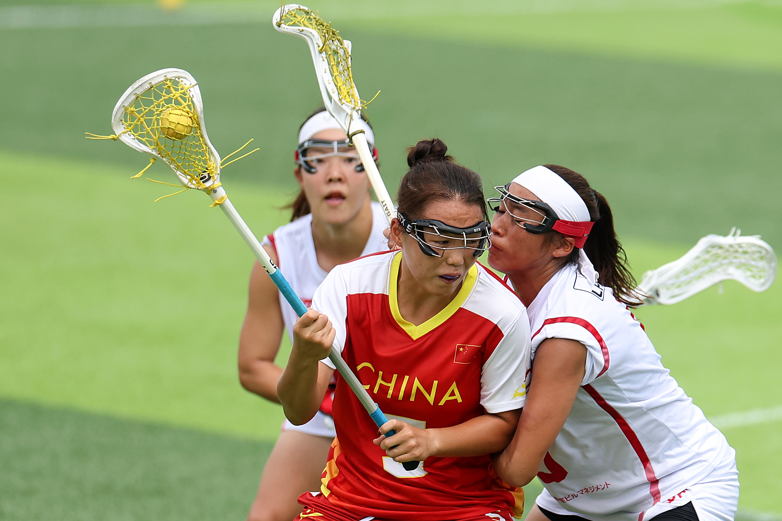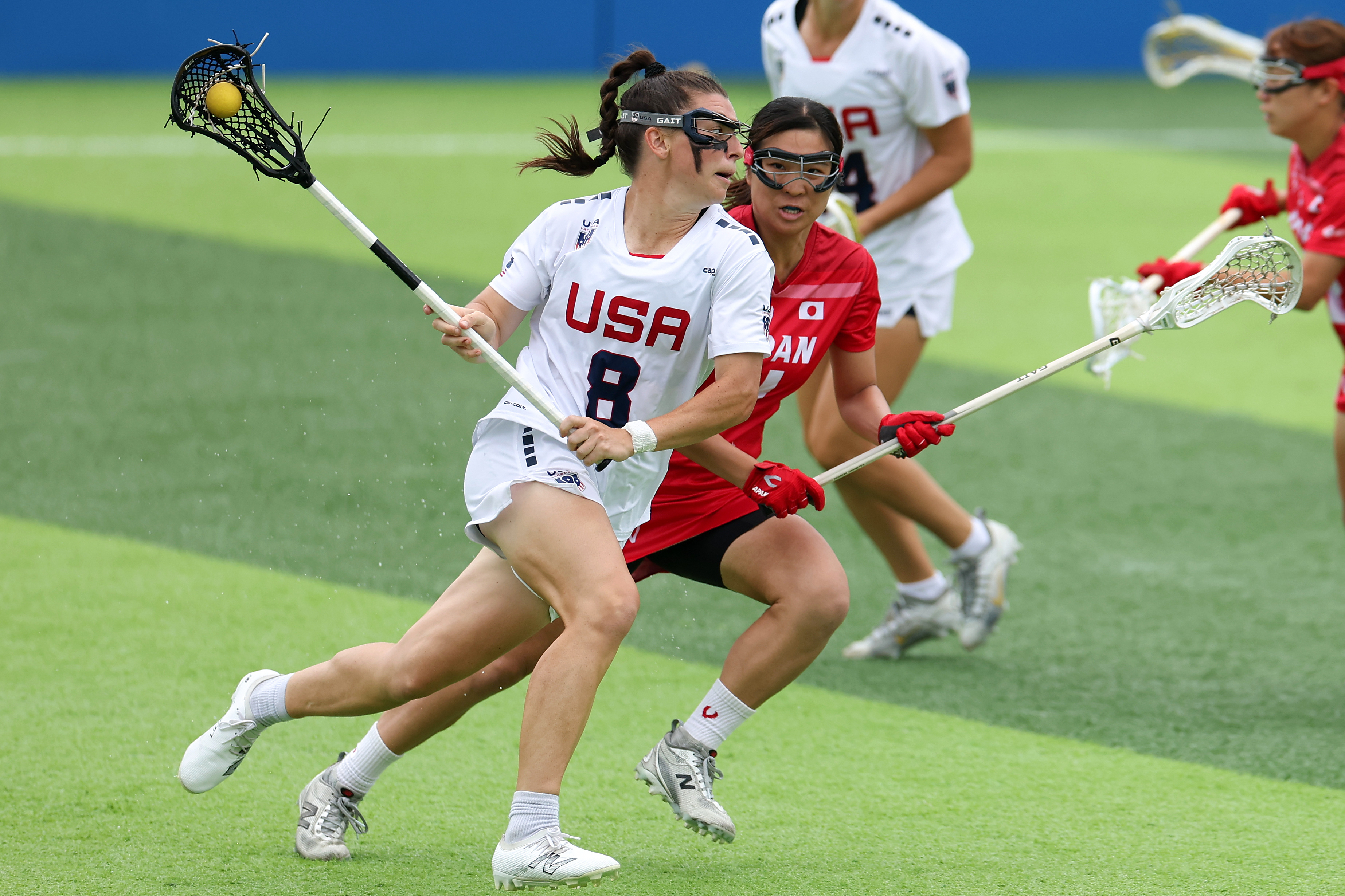 8月10日,美国队球员夏洛特·诺思(左一)在女子棍网球半决赛中进攻。新华社记者 陈斌 摄