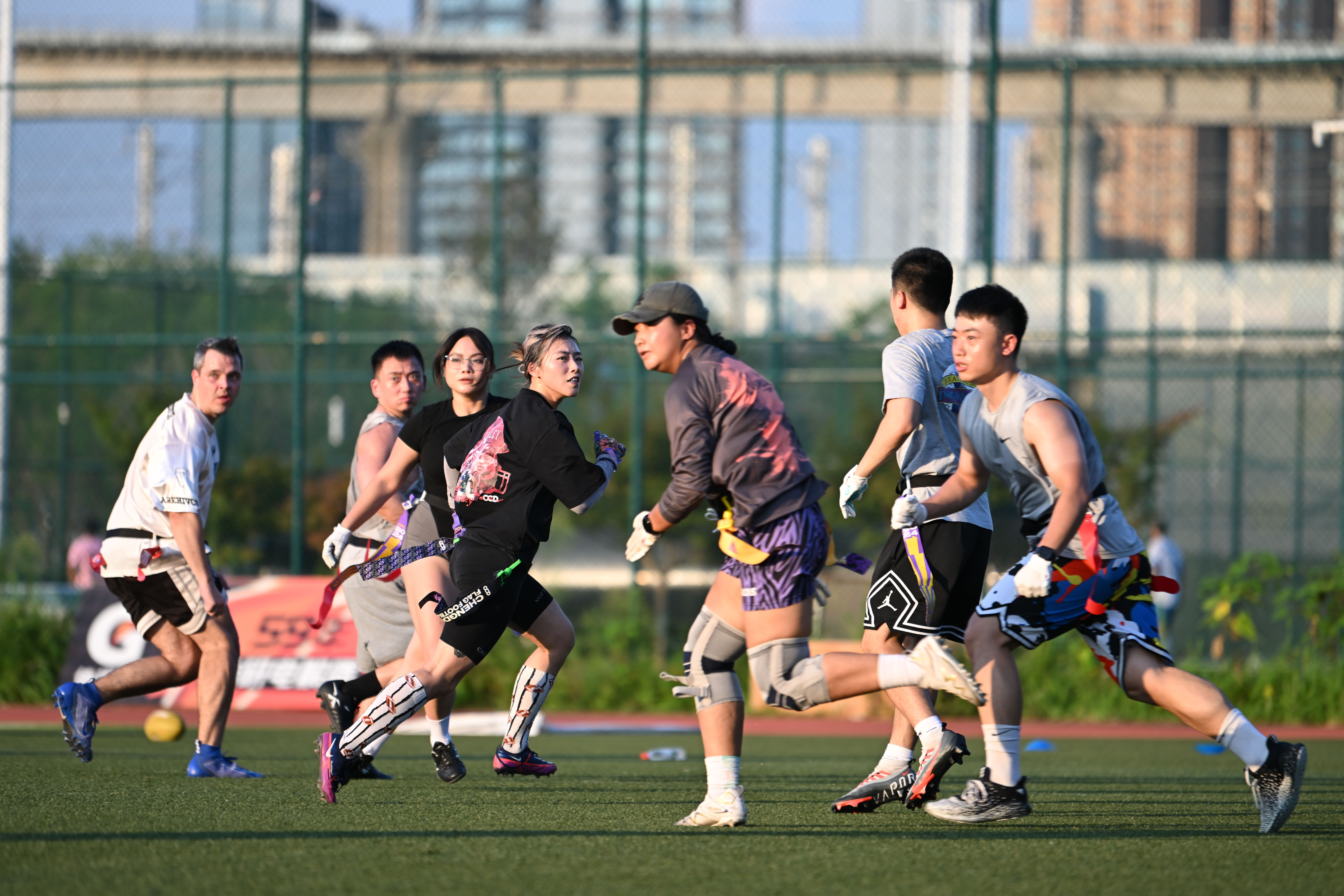 7月27日,在成都工作生活的运动爱好者吴庆文(左四)在腰旗橄榄球比赛中。新华社记者 胥冰洁 摄